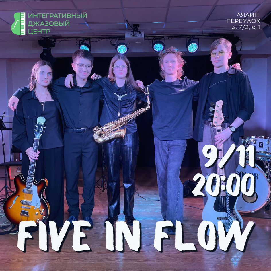 Приглашаем вас на встречу с творчеством молодёжного перспективного коллектива Five in Flow! Музыканты начали играть вместе в сентябре 2025 года, исполняют джаз, латину, баллады и фанковые композиции.